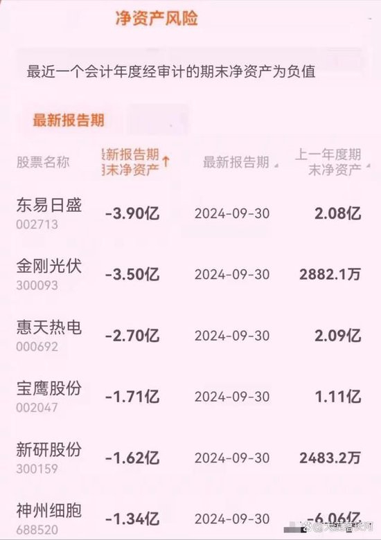 依据新规的相关规定,倘若上市公司最近一个会计年度经审计的期末净资产呈负值,亦或追溯最近一个会计年度期末净资产为负值,那么此公司的股票将会被予以退市风险警示(ST)。目前,包括东易日盛、金刚光伏、惠天热电、宝鹰股份、新研股份、神州细胞等6家上市公司前三季净资产均为负值,2024 年年报中的净资产将成为判定是否被 ST 的最终凭据。