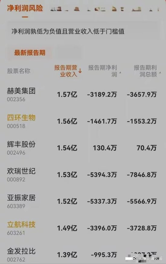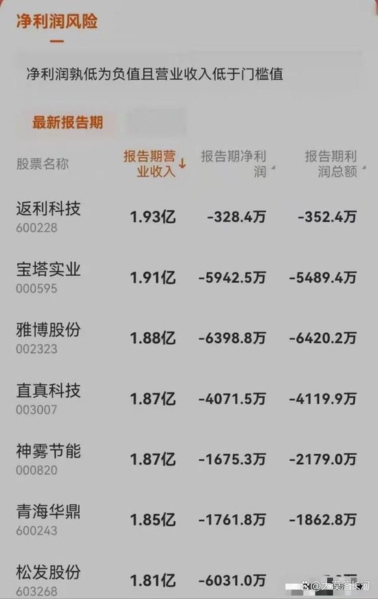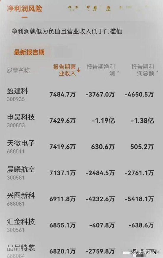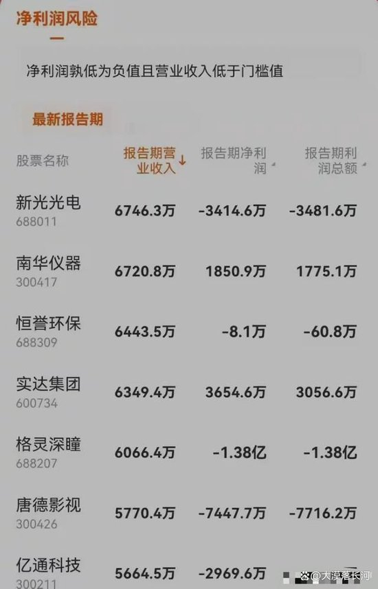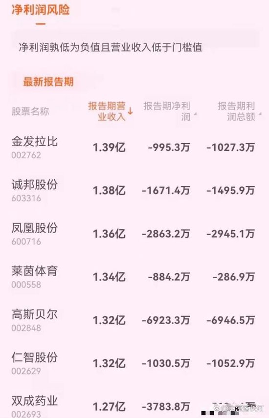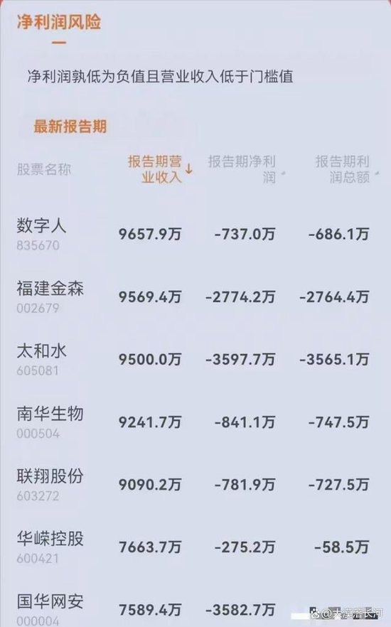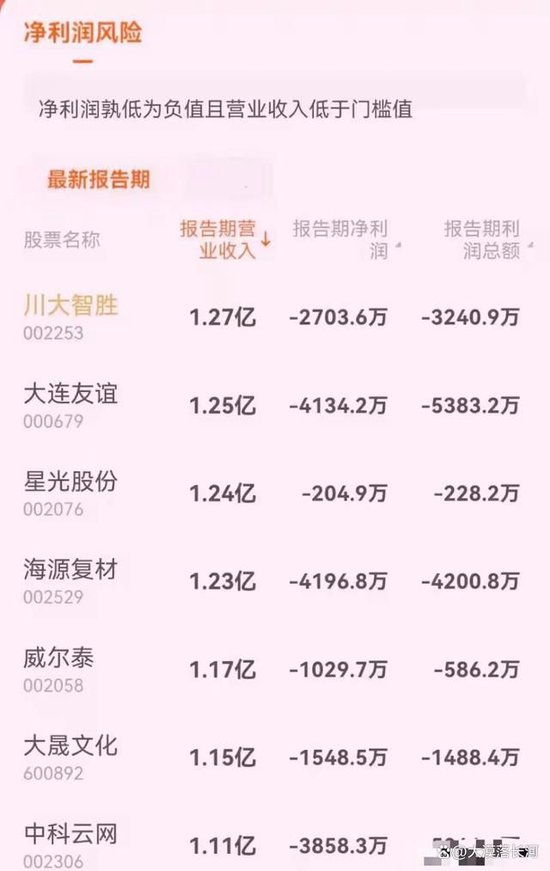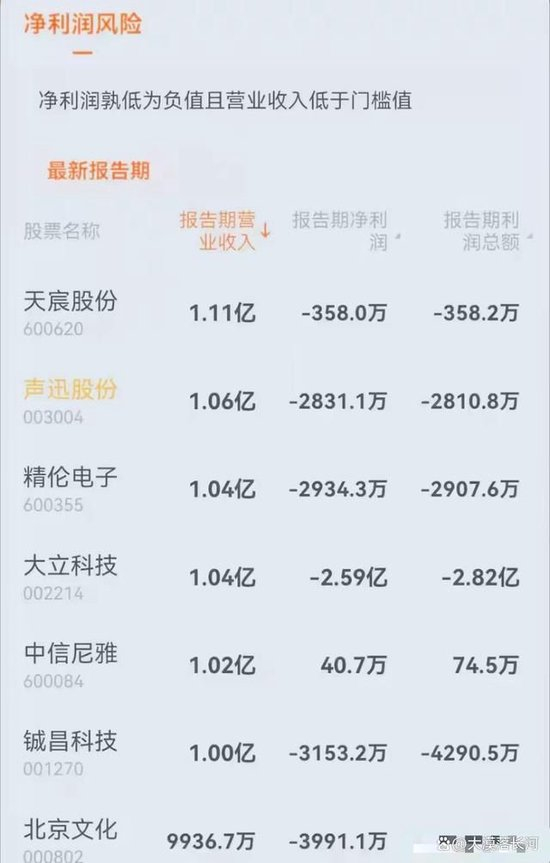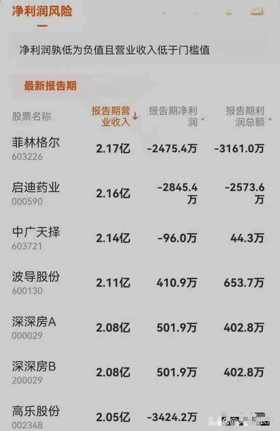 2.“净利润+营业收入”低于标准值,实施(*ST)退市风险警示