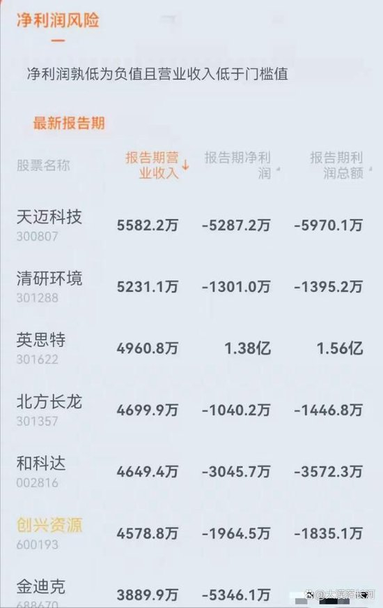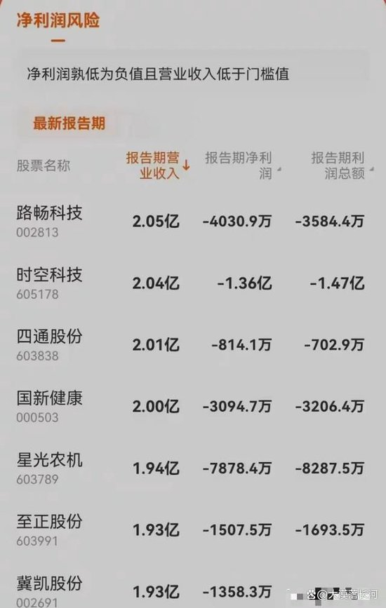 根据新规的相关规定,上市公司最近一个会计年度经审计的利润总额、净利润、 扣除非经常性损益后的净利润三者孰低为负值,且营业收入低于门槛值(沪深主板<3亿元;双创板<1亿元;北交所<5000万元),将被实施(*ST)退市风险警示。前三季度财报显示,沪深京交所中有98家上市公司触及了这样的红线,年报数值将确定是否遭到*ST处置。