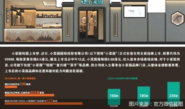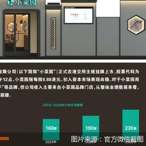 小菜园终圆上市梦。近日,小菜园国际控股有限公司(以下简称“小菜园”)正式在港交所主板挂牌上市,股票代码为00999,每股发售价格8.5港元,截至上市当日中午12点,小菜园报每股8.88港元,初入资本市场表现尚稳。对于小菜园而言,公司旗下包括“小菜园”“观邸”“复兴楼”“菜手”等品牌,但公司收入主要来自小菜园品牌门店,从整体业绩数据来看,上市后的小菜园品牌知名度和盈利能力问题迫在眉睫。