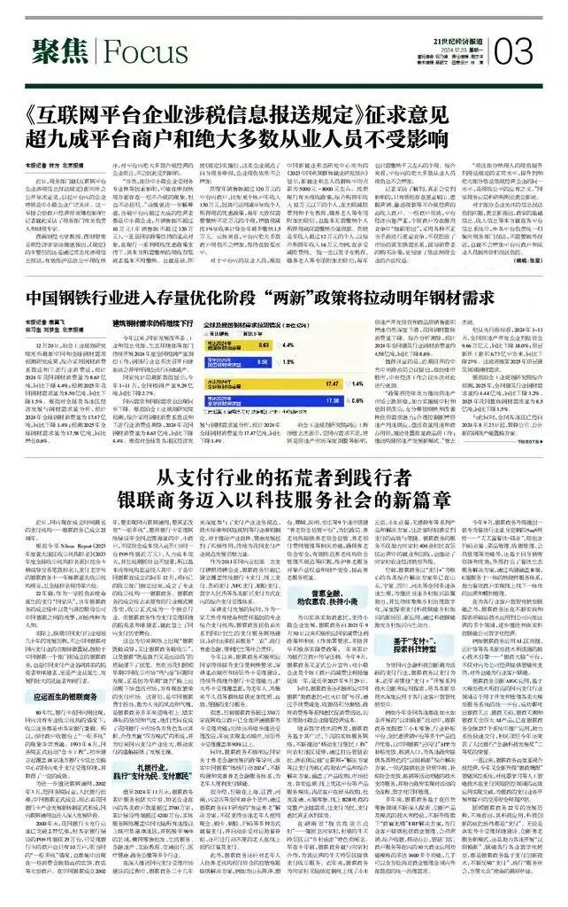 2024年12月20日,冶金工业规划研究院举办“2025中国和全球钢材需求预测、2024中国钢铁企业竞争力(暨发展质量)评级、2024中国钢铁企业ESG评级研究成果发布会”,各大媒体给予广泛关注。以下为21世纪经济报道对本次发布会的相关报道。