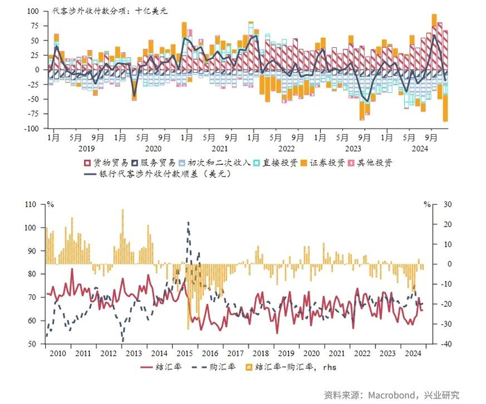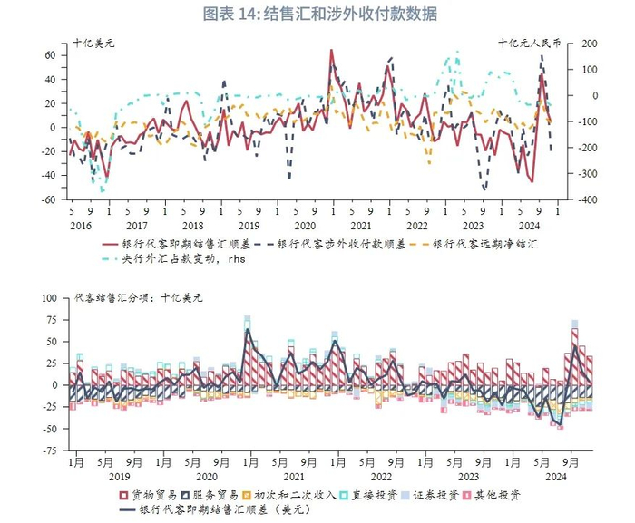 2024年11月,银行代客结售汇录得顺差41亿美元,前值为顺差158亿美元,环比顺差缩窄117亿美元;银行远期代客净结汇顺差39亿美元,前值顺差76亿美元,环比顺差缩窄37亿美元;银行代客涉外收付款逆差195亿美元,前值顺差328亿美元,环比逆差扩大523亿美元。