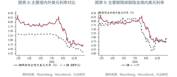 行情研判方面,2024年剩余时间,美元兑人民币预计维持稳定,跨入2025年后人民币汇率压力将逐步释放。从金融机构外汇存款增速的变化来看,境内美元流动性重返紧张,预示着人民币汇率升值的基本面支撑边际减弱。此外特朗普上任时点临近,需密切追踪关税进展。