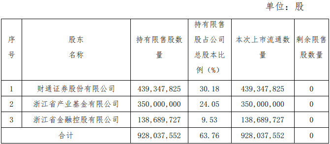 此次解禁股东共三位,分别为东财通证券股份有限公司、浙江省产业基金有限公司、浙江省金融控股有限公司,为永安期货第一、二、四大股东。