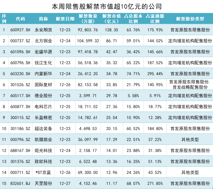 永安期货是本周唯一一家解禁市值超过百亿元的公司。根据公告,公司12月23日有9.28亿股首发限售股上市流通,占总股本比例的63.76%,约合解禁市值128.35亿元。