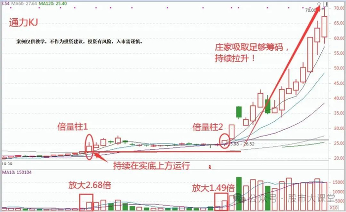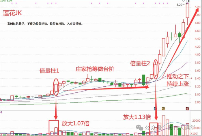 倍量柱的出现就是主力抢筹的标志,主力倍量拉升就相当于倍量抢筹,尤其是大牛股在准备期做台阶的时候,倍量柱的作用就尤为重要了。