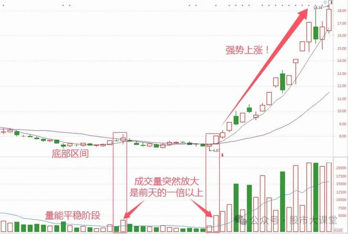 倍量柱就是相较昨天而言,成交量放大一倍多的量柱,如“鹤立鸡群”般非常醒目,所有大牛股出现前,都会出现倍量柱!