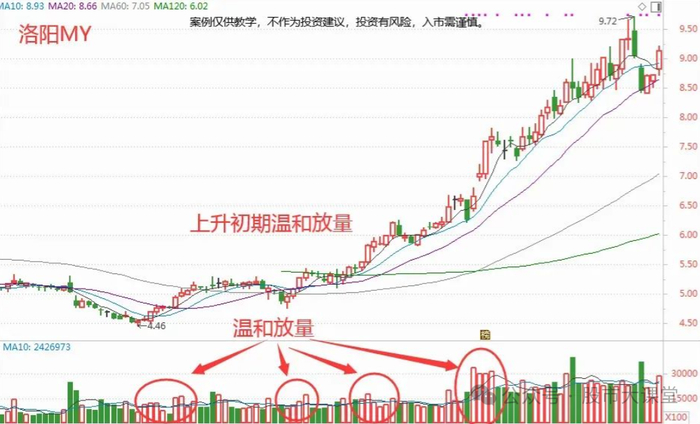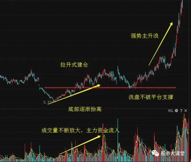 主力在拉升阶段有两个量能形态,第一种是温和放量资金在逐步参与,形成量能的逐步温和式上升,此种情况有可能形成一波反弹或者反转行情,是一个较为积极的上升信号。