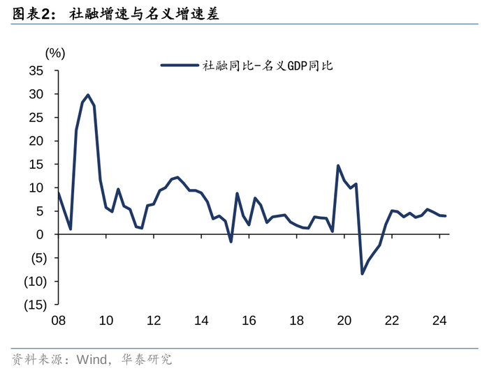 与此同时,债务对经济的驱动效能却在降低。从社融和名义GDP增速差来看,此前每轮宽信用周期都会导致二者增速差先扩大,后收窄,这说明宽信用首先带来债务增长,再带来经济增长。但2020年一轮宽信用之后,社融-GDP增速差快速上升至4-5个百分点,之后依旧维持在该水平,说明债务驱动对经济增长的作用有所降低。
