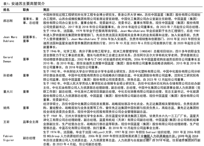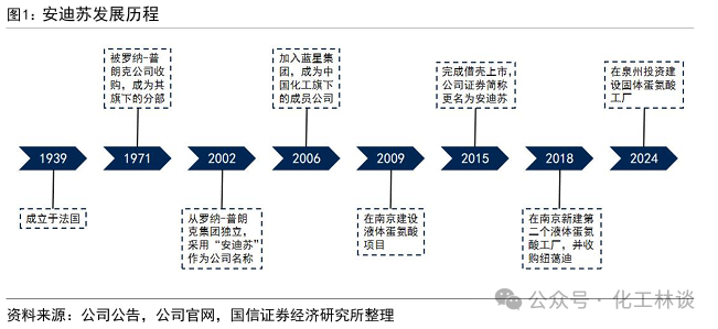 公司发展历程:1939年,化学工程师Marcel Lingot在法国创立了安迪苏公司的前身——AEC公司。1945年,AEC首次完成DL-蛋氨酸的人工合成,并自1950s起在法国建设了固体蛋氨酸合成工厂。1971年,公司被罗纳-普朗克公司收购,成为其旗下的动物营养分部。2002年,公司从罗纳-普朗克集团独立,正式采用“安迪苏”作为公司名称。2006年,安迪苏被蓝星集团收购,由此成为中国中化旗下的成员公司。2009年,安迪苏开始在南京建设国内首个液体蛋氨酸项目,一期7万吨/年产能于2013年建成投产,二期7万吨/年产能于2016年建成投产。2015年,公司通过与蓝星新材进行重大资产重组并募集配套资金,完成借壳上市,证券简称由“蓝星新材”变更为“安迪苏”。2018年,公司开始在南京新建第二个18万吨/年液体蛋氨酸工厂(2022年投产),并收购全球饲料添加剂生产商纽蔼迪。2020年,公司收购FRA® melco,并与恺勒司成立合资公司恺迪苏(重庆)。2023年,公司分别在欧洲、中国新建特种产品生产基地,并收购法国Nor-feed集团。2024年,公司在泉州投资建设15万吨/年固体蛋氨酸工厂。目前,安迪苏已成为全球领先的动物营养添加剂生产企业,以丰富的产品组合、完善的销售平台和强大的技术支持团队,向全球110多个国家超过4200名客户提供创新动物营养添加剂解决方案。