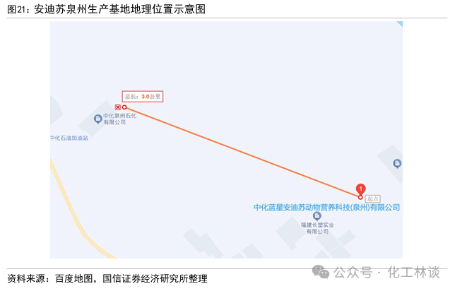 泉州项目有南京项目成功经验可借鉴,且可充分发挥中化集团产业园区的配套优势。固体蛋氨酸与液体蛋氨酸生产工艺具有一定相似性,考虑到安迪苏南京工厂已成为世界上最大、技术先进、最具竞争力的液体蛋氨酸生产平台之一,因此我们预计泉州项目将会充分借鉴南京生产平台的建设运营经验,实现建设、生产、运营的高效推进。同时,泉州项目的选址毗邻中化泉州石化有限公司,预计能够发挥与中国中化及园区周边企业在原材料及能源供应方面的产业链协同效应,以提高项目经济效益。