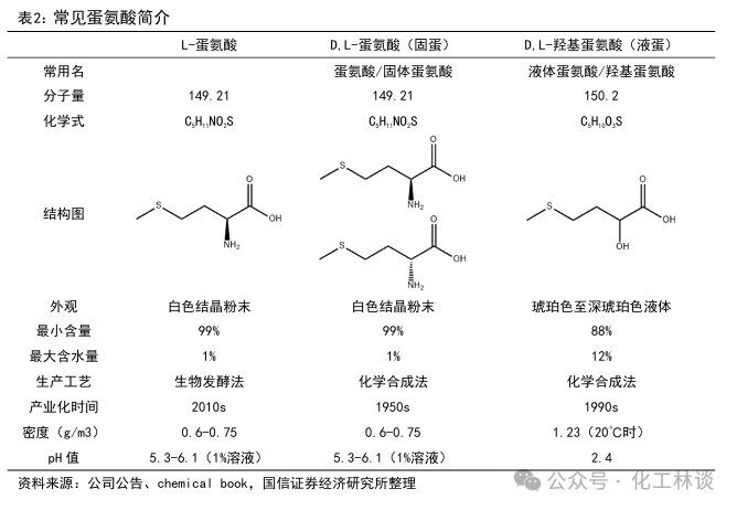 L-蛋氨酸、液体蛋氨酸与固体蛋氨酸的区分:生物界中各种蛋白质几乎都是由L型氨基酸所构成的,D型氨基酸在自然界中较少存在。L-蛋氨酸是自然界中的动物和植物蛋白质中蛋氨酸的生物活性形式;D,L-蛋氨酸是由50%的D-蛋氨酸和50%的L-蛋氨酸组成的混合物,常被称为固体蛋氨酸,其通过化学合成而产生,D-蛋氨酸在动物体内可以被相应的酶转化为L-蛋氨酸;D,L-羟基蛋氨酸通常又被称为液体蛋氨酸,属于蛋氨酸的前体物,可以通过动物体内的酶经过类似的途径转化为L-蛋氨酸。据安迪苏公告,在接近或超过动物对氨基酸的生物需要量时,L-蛋氨酸、固体蛋氨酸和液体蛋氨酸的生物学功效没有差别。