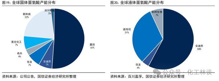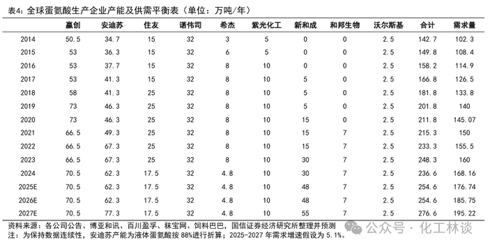 安迪苏:安迪苏南京工厂一期年产14万吨液体蛋氨酸项目一期工程(7万吨/年)于2013年建成试运行,二期工程(7万吨/年)于2016年建成投产。2022年安迪苏南京工厂二期年产18万吨液体蛋氨酸项目正式投产,加上一期项目后整体年产能达到35万吨/年。安迪苏拟在福建省泉州市新建15万吨/年固体蛋氨酸项目,工厂预计于 2027 年正式投入运营。