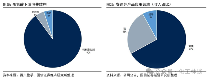 据百川盈孚,蛋氨酸下游应用中,饲料添加剂占比90%,化妆品和医药各占5%,因此养殖业是蛋氨酸最主要的需求领域。安迪苏的主要产品包括蛋氨酸、维生素、酶制剂等动物营养添加剂,按产品应用的动物品种为禽类、猪和奶牛,占比分别约为67%、25%、8%。