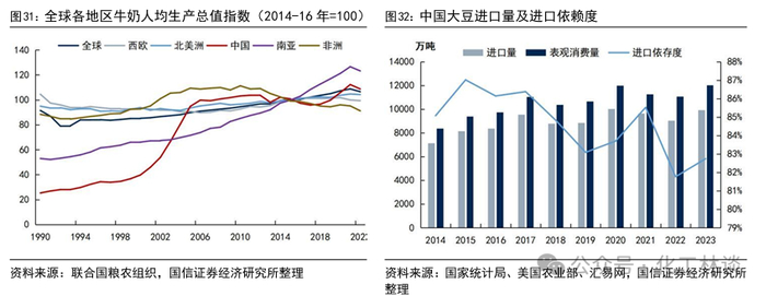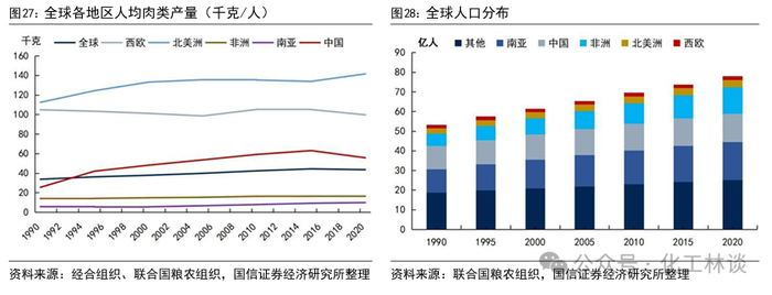 从全球人均肉类消费量角度分析,全球蛋氨酸需求仍有较大的提升空间。据经合组织OECD数据,全球猪肉消费量从1990年的6286.32万吨增长至2022年的12070.67万吨,年均复合增速2.06%。全球禽肉消费量从1990年的2843.84万吨增长至2022年的13735.56万吨,年均复合增速5.04%。据经合组织、联合国粮农组织数据,2023年发展中国家、发达国家、全球整体人均禽肉消费量分别为7.85、20.94、10.23千克,发达国家人均禽肉消费量是发展中国家的2.67倍;其中美国人均禽肉消费量达35.74千克,远高于发达国家整体水平,是非洲地区人均3.99千克的8.96倍。而从1990年以来全球人口分布变化情况看,发展中国家人口占全球总人口的80%以上,且人口增速高于发达国家。此外,从人均GDP角度分析,印度、非洲等国家和地区的人均GDP仅为欧美等发达国家的3%-5%,尚有较大的提升空间。因此,综合全球猪禽消费量、人均禽肉消费量、全球人口分布及全球各地区GDP差距等客观现实,我们认为全球猪禽消费量及牛奶消费量仍有较大提升空间,从而对全球蛋氨酸需求提供有力支撑。