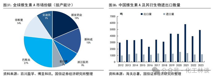 SVA行业集中度高,全球产能主要集中在中国、西欧。从VA的全球供给看,目前全球VA产能合计约5.39万吨/年,中国企业的产能占比约为50.1%。VA方面,生产企业主要包括国外的巴斯夫、帝斯曼、安迪苏和国内的新发医药、新和成、浙江医药,其中巴斯夫产能1.44万吨/年,占比约27%,其中的6400吨/年产能(规格50万IU/g产能,折280万IU/g规格产能为1500吨/年)于2020年在巴斯夫德国路德维希港一体化工厂投产。从进出口数量情况来看,我国为VA净出口国,VA出口量逐年稳步提升,进口量基本保持稳定。据海关总署,2023年,我国维生素A及其衍生物出口量4923.72吨,进口量1188.34吨。