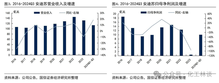 安迪苏是中国中化旗下专注于动物营养领域的创新性企业。安迪苏现是中国中化旗下的成员公司,是一家具有80余年发展历史的全球化动物营养添加剂龙头企业,目前安迪苏已向全球110多个国家超过4200名客户提供创新动物营养添加剂解决方案。2024年以来,受益于蛋氨酸、维生素等饲料添加剂价格回暖,安迪苏的盈利水平逐渐改善,2024年前三季度,安迪苏实现营业收入113.76亿元,同比+18.32%;归母净利润10.03 亿元,同比+3016.00%。