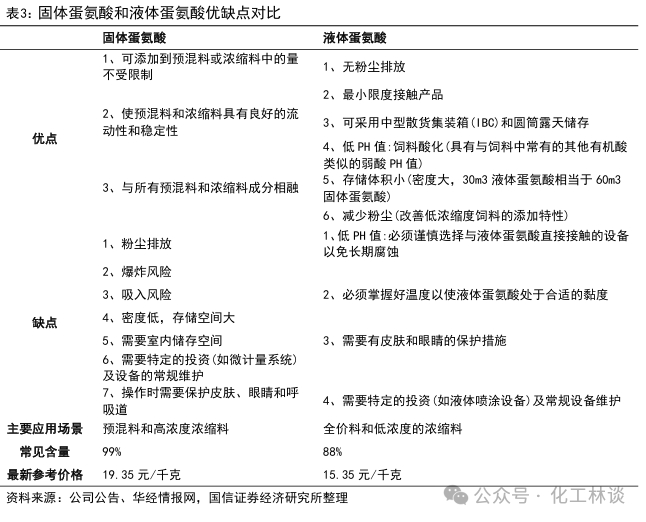 液蛋与固蛋性能对比:目前市场供应的蛋氨酸主要包括固体蛋氨酸和液体蛋氨酸,两者的市场渗透率分别为60%与40%左右(平均值,不同地区差异较大)。液体蛋氨酸通过使用专业喷撒系统给料,能够实现自动化控制,降低人工给料误差和风险,达到精准定量和均匀混合;同时液蛋可消除固体蛋氨酸在运输和储存中可能产生爆炸的风险,更加安全高效。因此规模较大、自动化程度较高的客户更倾向于使用液体蛋氨酸。液体蛋氨酸相比固体蛋氨酸的缺点在于液体蛋氨酸需要专门的喷淋装置,通常应用于规模饲料企业和规模化养殖场,此外液体蛋氨酸在低温时,黏度变大,流动性变差,不适合于低温使用。从市场价格看,液蛋一般含量为88%,低于固蛋的99%,且液蛋的生产成本比固蛋更具竞争力,因此液蛋售价一般比固蛋便宜一些。