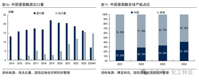 国内蛋氨酸企业的扩产节奏可以通过固蛋出口数据进行验证:从固体蛋氨酸的进出口数据看,2019年以前我国固体蛋氨酸的年进口量呈上升趋势,而2019年开始固体蛋氨酸的进口量持续下降,同时2019年起我国固体蛋氨酸的年出口量逐年提升,2024年上半年我国共进口固体蛋氨酸6.96万吨,出口14.78万吨,出口量首次大幅超过进口量,反映出国内固体蛋氨酸生产企业产能不断爬坡。据博亚和讯,我国蛋氨酸的全球产能占比已从2021年的23.5%提升至2024年的41%。