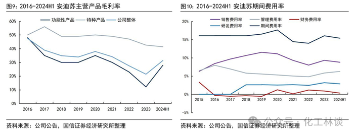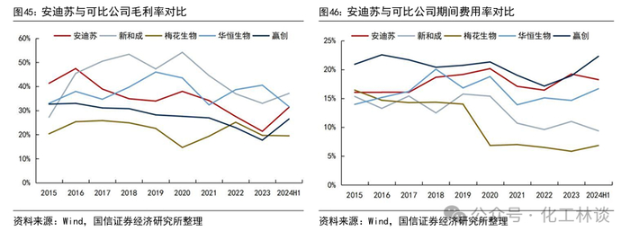 2024年以来安迪苏的功能性产品毛利率持续改善。2016-2023年间,全球的蛋氨酸行业进入新一轮扩产周期,期间行业供过于求矛盾不断凸显,蛋氨酸市场价格整体呈现下降趋势,据博亚和讯,2023年国内蛋氨酸市场均价较2016年下降34%,而2023年下半年以来全球蛋氨酸的扩产节奏明显放缓,蛋氨酸市场价格也触底反弹,2024年前11月蛋氨酸均价较2023年均价上涨约14%。安迪苏的毛利率与蛋氨酸价格走势有着较强的相关关系,2016-2023年间安迪苏的毛利率从47.43%下降至21.38%,2024年上半年又回升至31.36%。期间费用率方面,作为拥有80余年经营历史的跨国公司,安迪苏的费用控制水平较为出色,其2016-2024年上半年其期间费用率始终维持在15%上下,没有大幅波动。
