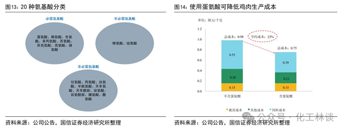 使用蛋氨酸可提高肉类生产效率。蛋氨酸是动物“必需氨基酸”之一,同时也是家禽生产第一“限制性氨基酸”。家禽无法自然合成蛋氨酸,必须通过采食摄取。在饲料中添加蛋氨酸,可以按照动物生理对氨基酸需求,均衡饲料配给,进而减少饲料成本,具有较高经济价值。目前国内禽类饲料的主流配方中,蛋氨酸添加量在0.1%-0.3%左右,同时使用鱼粉等作为饲料中氨基酸的补充来源。根据安迪苏测算,在营养成分摄取量一致的前提下,假设每单位重量饲料中添加0.20%蛋氨酸,每生产1千克成品鸡肉可节约生产成本约0.23欧元,与不使用蛋氨酸的成本相比降低23%,能有效提高家禽生产效率。