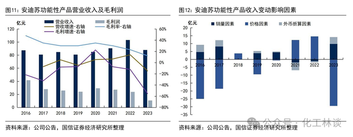 安迪苏的蛋氨酸业务包含在功能性产品业务中。安迪苏的功能性产品包含蛋氨酸、硫酸铵、硫酸钠和硫产品等蛋氨酸产业链相关产品,以及小部分维生素产品。