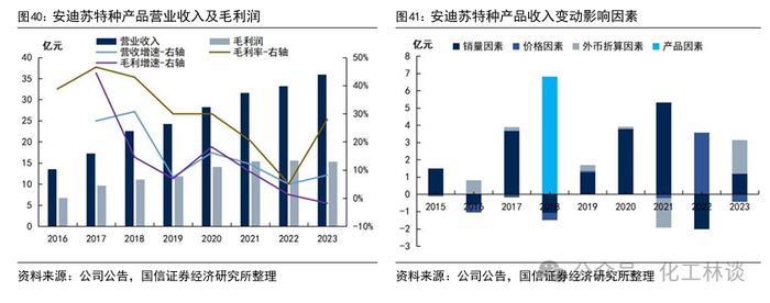特种产品已成为公司强有力的第二业务支柱。近年来安迪苏一直积极实施“双支柱”战略,即在不断巩固蛋氨酸行业领先地位的同时,加快特种业务的发展。特种产品与安迪苏的功能性产品极具互补性,有助于安迪苏打造一体化解决方案,最大限度的满足客户的采购需求。同时,安迪苏特种产品的毛利率始终保持在40%以上,明显高于公司的功能性产品,已成为公司继蛋氨酸等功能性产品外另一大利润增长点,帮助公司抵御功能性产品价格周期性波动对公司生产经营的不利影响。