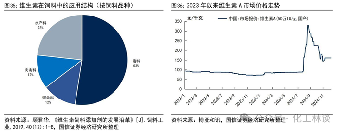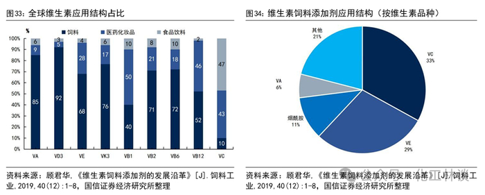 维生素的应用领域主要包括饲料、医药化妆品和食品饮料。在全球维生素应用构成中,80%的维生素作为饲料添加剂用于饲料畜牧行业,其余12%用于医药化妆品,8%用于食品饮料,其中85%的VA和68%的VE被用于生产饲料。在饲料配方中维生素饲料添加剂不可或缺,也是最昂贵的重要原料,具有一定的需求刚性,在饲用维生素中,VC、VE、烟酰胺(VB5)、VA四个品种占饲用维生素总量的79%。在饲料的应用结构中,猪料添加维生素用量约占52%、肉禽和蛋禽料各占12%、水产料占23%。在配合饲料中维生素添加比例一般为0.05%~0.1%,占产品成本的比重约为2%~5%,下游一般对维生素的价格变动的敏感性较低。