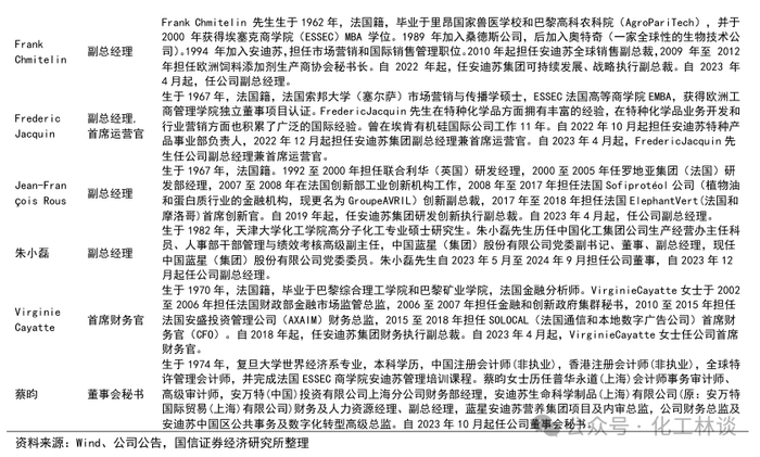 安迪苏拥有一支经验丰富的国际化管理团队,构建了多元化和包容性企业文化。安迪苏管理层主要由中法两国高管组成,多位高管在饲料行业拥有多年的专业知识和管理经验,中西方的智慧与力量以及自身全球化优势对安迪苏实现可持续增长起到积极作用。此外,安迪苏构建了多元化和包容性的优秀企业文化、员工培养机制和创新激励机制,为自身持续发展提供内在动力。
