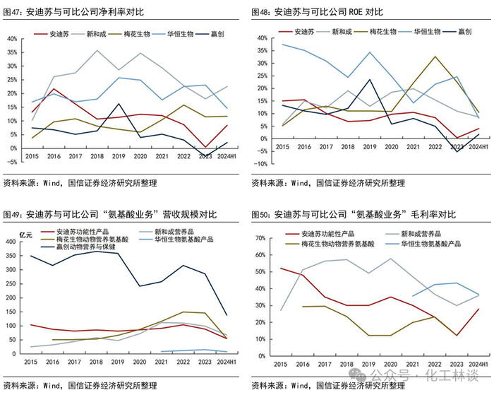 我们选取全球蛋氨酸市占率第一的赢创、国内蛋氨酸头部企业新和成、主营赖氨酸等大品种氨基酸的梅花生物、专注合成生物学生产小品种氨基酸的华恒生物作为安迪苏的可比公司。