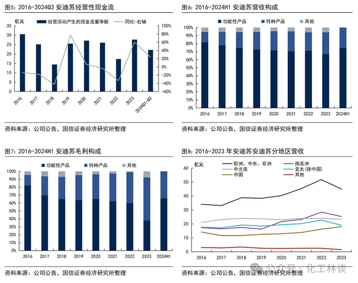 安迪苏双支柱战略:在不断巩固蛋氨酸行业领先地位的同时,加速特种产品业务的发展。安迪苏将践行双支柱战略:目前的主营业务可分为功能性产品(第一业务支柱)和特种产品(第二业务支柱),其中功能性产品包括蛋氨酸、维生素等;特种产品主要包括针对反刍动物、单胃动物、水产等领域开发的特种氨基酸、酶制剂、有机硒产品、益生菌产品及其他特种产品。2024年上半年,安迪苏的功能性产品和特种产品的营收占比分别为74.29%、25.71%,毛利占比分别为66.05%、33.95%。作为一家跨国公司,安迪苏的业务遍布全球110多个国家和地区,2016-2023年间,其在“欧洲、中东、非洲”、南美洲、中北美、亚太(除中国)、中国五大区域市场的营收均实现不同程度的增长,2023年以上五大区域在安迪苏的营收中占比分别为34.09%、19.15%、17.66%、14.38%、13.60%。