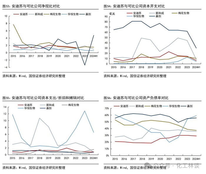 安迪苏的期间费用率低于同为跨国公司的赢创。2024年上半年安迪苏的销售期间费用率18.25%,高于新和成、梅花生物、华恒生物这3家以国内市场为主的企业,安迪苏、赢创作为两家跨国公司,员工的薪酬水平高于国内企业,物流费用、营销费用等也高于国内企业,因此管理费用和销售费用一般会高于国内企业,低于同为跨国公司赢创的22.29%。从净利率看,2024年上半年,安迪苏的净利率为8.37%,高于赢创,低于另外3家可比公司,这与安迪苏、赢创作为跨国公司的期间费用率较高息息相关。从ROE角度分析,2024年上半年安迪苏的ROE(摊薄)为4.01%,高于同为跨国公司的赢创,低于另外3家可比公司,这与三家公司的净利率水平相对应。
