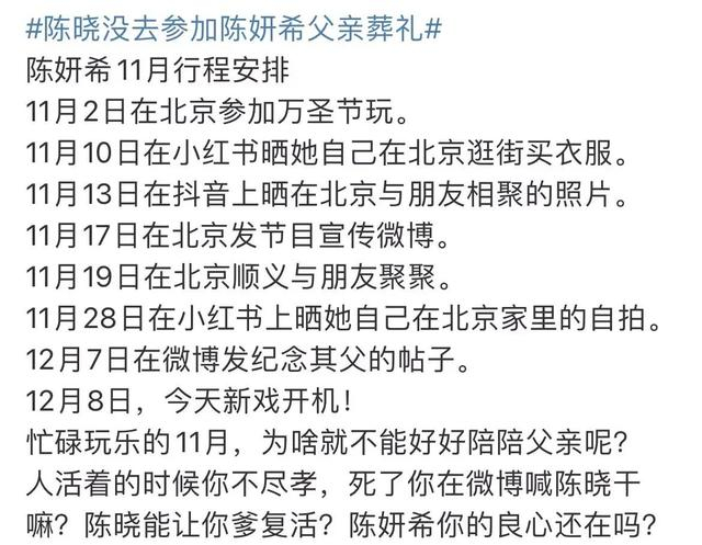 眼见自家偶像遭受攻击,便立刻挺身而出维护陈晓,转而将矛头指向陈妍希,指责她利用父亲的过世来为自己谋取舆论优势,甚至罗列出陈妍希的 “十宗罪”,其中包括在整个 11 月期间,陈妍希被指在社交平台上发布的动态显示其一直在吃喝玩乐,似乎并未全身心地陪伴病危的父亲,如今却反过来要求陈晓尽孝,这种行为在他们看来实在是离谱至极。双方粉丝各执一词,争吵得不可开交,大有将这一家务事彻底摆到台面上,让广大网友评判是非、选择站队的架势。这般夫妻间的 “纯恨” 状态,在娱乐圈中着实罕见,令人唏嘘不已。