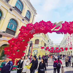 澳门街头随处可见庆祝澳门回归祖国25周年的装饰、宣传标语等,喜庆气氛浓厚。