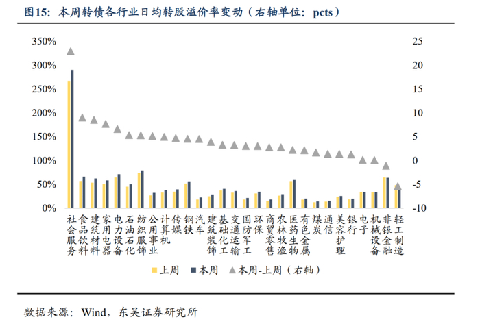 从各行业溢价率变化来看,本周27个行业转股溢价率走阔,其中21个行业走阔幅度超2pcts;社会服务、食品饮料、建筑材料、家用电器、电力设备等行业走阔幅度居前,分别达22.93pcts、9.02pcts、8.52pcts、7.70pcts、6.62pcts;轻工制造、非银金融等行业走窄幅度居前,分别达-5.37pcts、-1.09pcts。