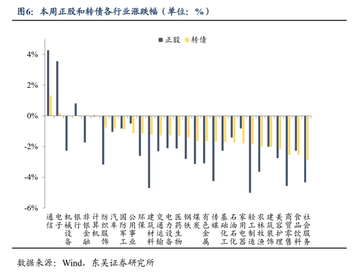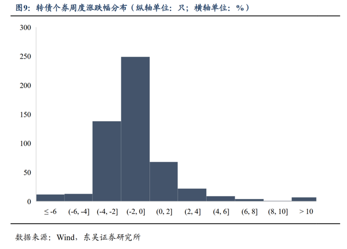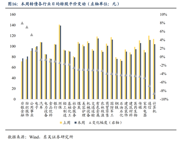 转股平价方面,本周4个行业平价有所走高,其中3个行业走阔幅度超2%;非银金融、纺织服饰、公用事业、电子等行业走阔幅度居前,分别达8.01%、7.06%、5.25%、1.54%;计算机、通信、家用电器、传媒、医药生物等行业走窄幅度居前,分别达-8.60%、-6.78%、-4.91%、-4.53%、-4.44%。