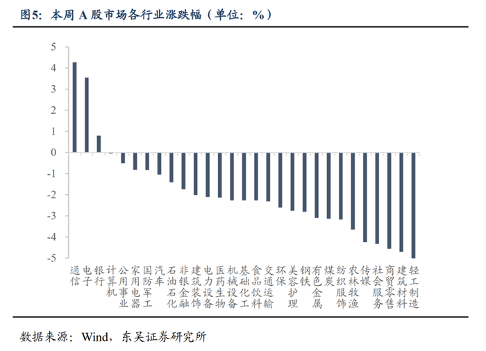 行业方面,本周(12月16日-12月20日)31个申万一级行业中3个行业收涨,其中2个行业涨幅超2%;通信、电子、银行涨幅居前,分别上涨4.27%、3.55%、0.81%;轻工制造、建筑材料、商贸零售、社会服务、传媒跌幅居前,跌幅分别达-5.01%、-4.70%、-4.56%、-4.33%、-4.25%。
