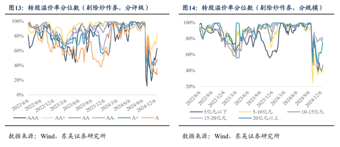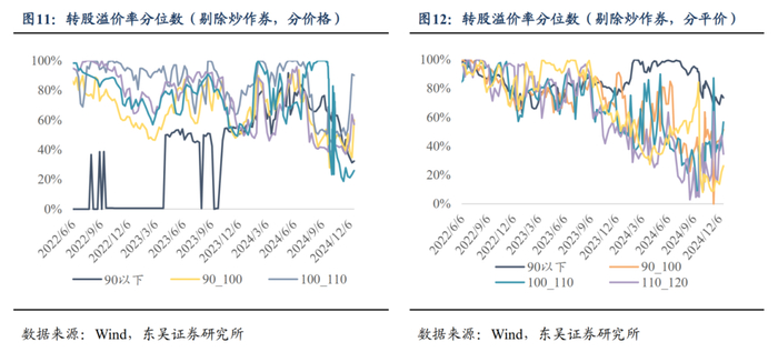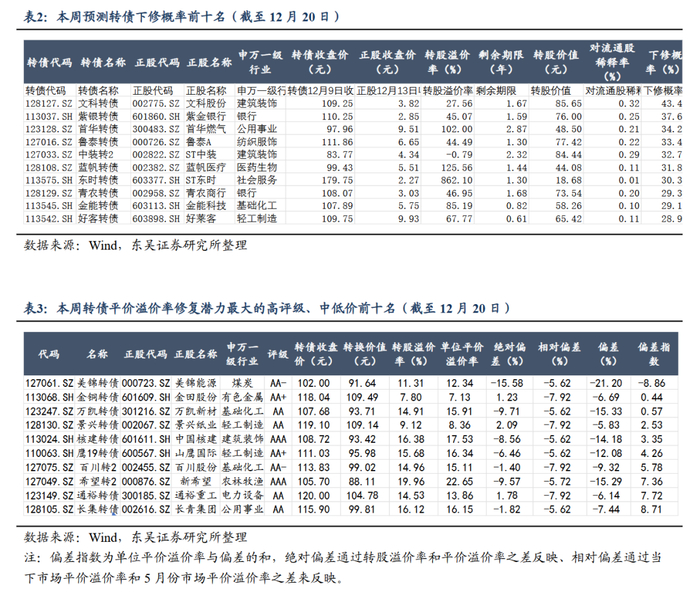 转股溢价率方面,本周(12月16日-12月20日)全市场转股溢价率回升,本周日均转股溢价率45.32%,较上周上升了3.11pcts。分价格区间来看,除100-110元和110-120元区间走窄外,其余价格的转债日均转股溢价率均走阔,其中90-100元价格区间的转债日均溢价率走阔幅度最大,达21.50pcts。分平价区间来看,除90元以下和110-120元区间走窄外,其余价格的转债日均转股溢价率均走阔,其中100-110元平价区间的转债走阔幅度最大,达2.87pcts。