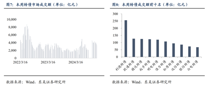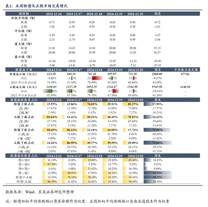 具体到交易日:周一(12月16日)转债的涨跌幅加权平均值、中位值均为负值,正股的涨跌幅加权平均值、中位值均为正值,且正股涨幅更大;转债成交额环比下跌0.02%,正股成交额环比下跌14.30%,分别位于2022年以来54.80%、92.80%的分位数水平;转债总体跌多涨少,正股总体涨多跌少,约19.55%、83.64%的转债、正股上涨,约86.59%的正股涨跌幅高于转债;总体上看,周一正股市场交易情绪更佳。周二(12月17日)转债、正股的涨跌幅加权平均值、中位值均为负值,且转债涨幅更大;转债成交额环比下跌3.22%,正股成交额环比下跌8.87%,分别位于2022年以来51.40%、87.50%的分位数水平;转债、正股总体跌多涨少,约13.86%、13.41%的转债、正股上涨,约78.18%的转债涨跌幅高于正股;总体上看,周二转债市场交易情绪更佳。周三(12月18日)转债、正股的涨跌幅加权平均值、中位值均为正值,且正股涨幅更大;转债成交额环比上涨23.03%,正股成交额环比下跌7.47%,分别位于2022年以来70.90%、79.70%的分位数水平;转债、正股总体涨多跌少,约76.82%、50.23%的转债、正股上涨,约58.18%的转债涨跌幅高于正股;总体上看,周三转债市场交易情绪更佳。周四(12月19日)转债、正股的涨跌幅加权平均值、中位值均为负值,且转债涨幅更大;转债成交额环比下跌6.37%,正股成交额环比上涨8.79%,分别位于2022年以来65.60%、87.90%的分位数水平;转债、正股总体跌多涨少,约35.91%、40.45%的转债、正股上涨,约54.32%的转债涨跌幅高于正股;总体上看,周四正股市场交易情绪更佳。周五(12月20日)转债、正股的涨跌幅加权平均值、中位值均为正值,且转债涨幅更大;转债成交额环比上涨3.65%,正股成交额环比上涨1.76%,分别位于2022年以来68.60%、89.80%的分位数水平;转债、正股总体涨多跌少,约82.27%、70.91%的转债、正股上涨,约56.59%的正股涨跌幅高于转债;总体上看,周五转债市场交易情绪更佳。