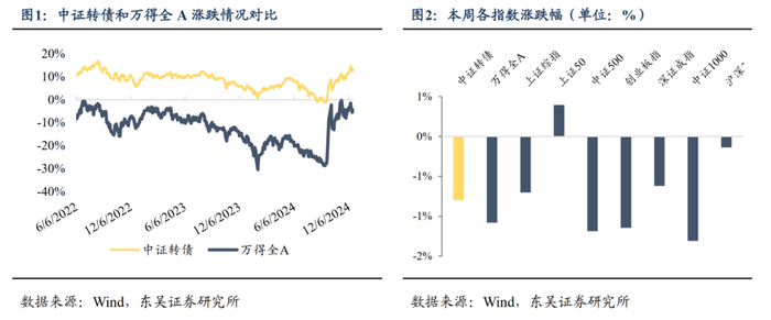权益市场方面,本周(12月16日-12月20日)权益市场总体下跌;上证综指累计下跌0.70%,收报3368.07点;深证成指累计下跌0.62%,收报10646.62点;创业板指累计下跌1.15%,收报2209.66点;沪深300累计下跌0.14%,收报3927.74点。转债市场方面,转债市场整体下跌,下跌幅达0.80%,收报416.61点。