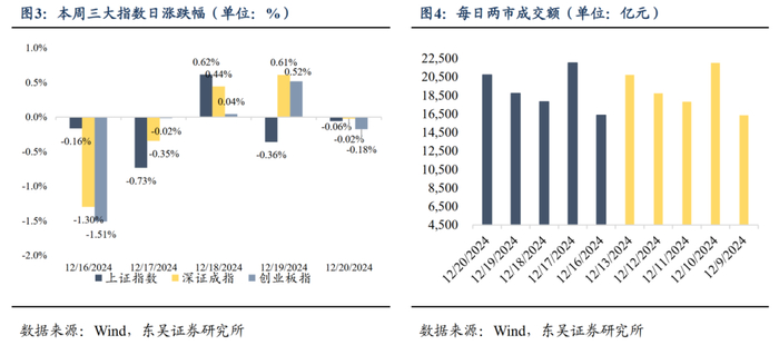本周(12月16日-12月20日)权益市场总体下跌,全指数收跌。两市日均成交额较上周缩量约0.00亿元至20457.32亿元,周度环比回升15.59%。