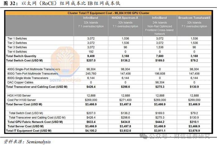 IB是仍是高密度AI训练集群的最优解,以太网(RoCE)的生态基础和性价比更优。IB网络原生支持RDMA,在延迟、带宽、吞吐量等方面都要强于以太网,缺点主要在于成本较高、兼容性较弱等方面。而以太网的优势主要在于:1)性价比。根据咨询机构Semianalysis的分析,12888台HGX H100服务器组成的算力集群使用以太网(RoCE)组网的网络设备成本要比IB组网的网络设备成本低50%左右甚至更多;2)兼容性和通用性。以太网(RoCE)的生态基础更加深厚,具有很好的兼容性和通用性,以太网下的AIGC集群可以无缝衔接现有的公有云集群,使用统一运维团队,并且可以使用来自不同供应商的硬件。3)扩展性。以太网支持更大规模的网络扩展,可以适应不断增长的计算需求。NVIDIA的Spectrum-X以太网交换机提供了128个400G端口,而NVIDIA的Quantum-2 IB交换机只有64个400G端口,根据咨询机构Semianalysis的分析,三层网络架构下IB方案下仅能完成65536个H100的完全互联,而以太网方案可以实现十万个H100的完全互联。随着以太网(RoCE)的进一步调优,以及推理需求占比的进一步提升,以太网(RoCE)的渗透率有望进一步提升。