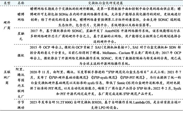 表9:上下游各厂商交换机白盒化研发进展