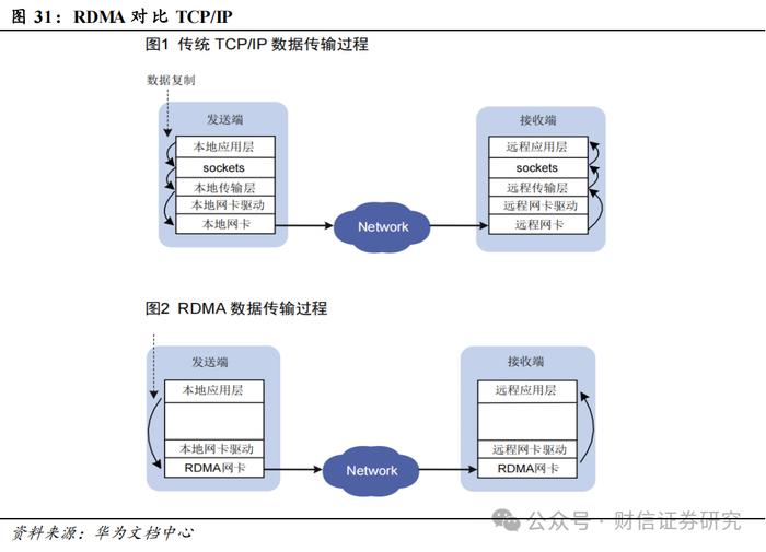 RDMA技术广泛适用于高性能数据中心网络。面对高性能计算、大数据分析等数据中心场景,传统的 TCP/IP 软硬件架构及应用存在着网络传输和数据处理的延迟过大、存在多次数据拷贝和中断处理、复杂的 TCP/IP 协议处理等问题。RDMA(Remote Direct Memory Access,远程直接内存访问)是一种为了解决网络传输中服务器端数据处理延迟而产生的技术。RDMA技术能直接通过网络接口访问内存数据,无需操作系统内核的介入。这种允许高吞吐、低延迟的网络通信,尤其适合在大规模并行计算机集群中使用。