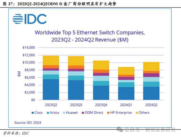 数据中心是目前白盒交换机最大的,也是增速最快的下游应用场景。数据中心通常使用高性能以太网交换机,实现计算资源之间的快速通信。大型数据中心的网络需求体现在三个方面:高度稳定性、高度可管可控、高性能低成本。数据中心场景需求明确,对软件特性的要求相对简单,拓扑结构明确,因此非常适合采用白盒交换机。通过部署白盒交换机,相关厂商/企业能够自主掌控软硬件运营体系,搭建更低成本、更为可靠、高度可控、高度自动化、智能化的数据中心网络,最终提供更优质服务。在数据中心领域,网络软件化和硬件白盒化或已成为趋势,根据IDC数据,2024年第二季度原始设备制造商(ODM)直销在数据中心领域持续增长,同比增长66.9%,占数据中心细分市场收入的19.1%。