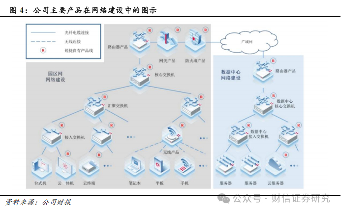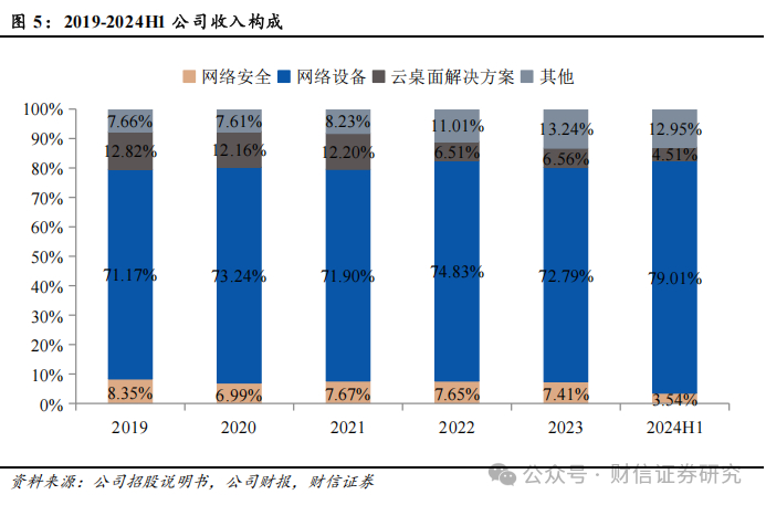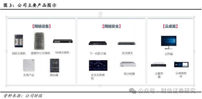 公司主要产品包括网络设备(交换机、路由器、无线产品等)、网络安全产品(安全网关、下一代防火墙、安全态势感知平台等)、云桌面整体解决方案(云服务器、云终端、云桌面软件)以及 IT 运维、身份管理、原材料出售、客户服务收入等其他类产品及服务。公司产品遍及网络建设中的各主要层级,广泛应用于局域网、城域网、广域网等各类型计算机网络中,承担网络通信及保障网络安全的重要作用,并融合云计算、虚拟化等技术为各领域用户提供灵活、高效、安全的云桌面解决方案。