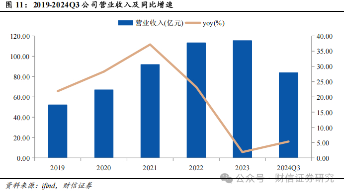 公司收入从2019年至今稳健增长,CAGR达21.94%。公司收入从2019年的52.20亿元增长至2023年的115.42亿元,CAGR达到21.94%。2022-2023年收入增速有所下滑,2024年前三季度收入增速有所回暖。2024年前三季度公司实现收入83.77亿元,同比增长5.36%。