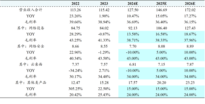 1)网络设备:考虑到1)互联网客户AI算网设备需求激增,数据中心交换机产品有望迅速放量;2)运营商客户需求平稳增长,政企客户IT需求短暂承压,未来有望随着宏观经济情况改善而逐年回暖。预计2024-2026年公司网络设备收入同比增长13.58%/16.58%/18.67%,毛利率略有承压。
