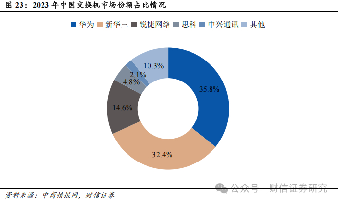 国内交换机行业集中度较高,呈现寡头竞争的竞争格局。华为、新华三和锐捷网络占据大部分的市场份额,根据中商情报网数据,2023年市占率分别为35.8%、32.4%和14.6%;思科和中兴通讯市占率分别为4.8%和2.1%。