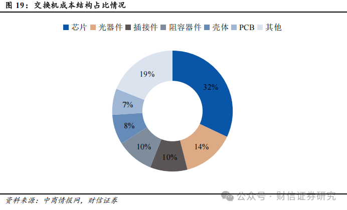 交换机成本结构中芯片占比最大,中游交换机制造厂商通常采取自研芯片或者外采商用芯片的方式。交换机的主要原材料包括芯片(以太网交换芯片、CPU、PHY)、元器件、光模块、电路板、电源模块等,其中芯片作为网络设备的核心零部件,对于网络设备产品性能有着重要影响,价值量占比也最大,约占到交换机成本32%左右。目前,网络设备厂商的芯片解决方案主要包括两种:1)部分如思科、华为和Juniper 等厂商拥有自研芯片的能力,其高端产品主要应用自研芯片,同时也在部分产品中使用从Broadcom、Intel等外部芯片厂商采购的商用芯片;2)部分如锐捷网络、新华三以及Arista等厂商主要从Broadcom、Intel等外部芯片厂商采购商用芯片并应用在自身产品中。